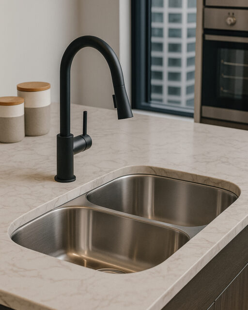 Fregadero bajo tope doble 80×46 cm: moderno, resistente y funcional para cocinas exigentes.