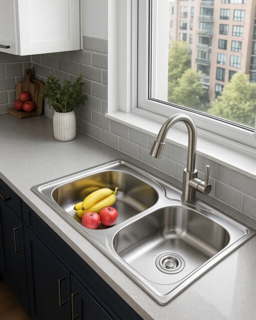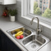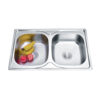 Fregadero sobrepuesto de dos pozos 80×50 cm en acero inoxidable. Amplio, resistente y funcional para cocinas modernas que requieren mayor capacidad y eficiencia.