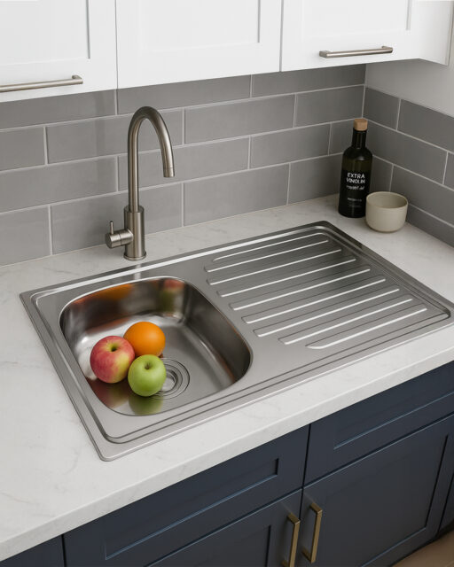Fregadero sobrepuesto 100×50 cm de un pozo con escurridor, amplio y resistente. Ideal para cocinas modernas que buscan mayor confort y organización.
