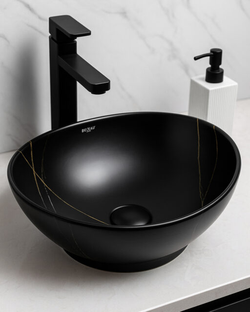 Lavamanos Vela Negro Marmoleado: diseño elegante y moderno con acabado marmoleado en negro para un baño sofisticado.